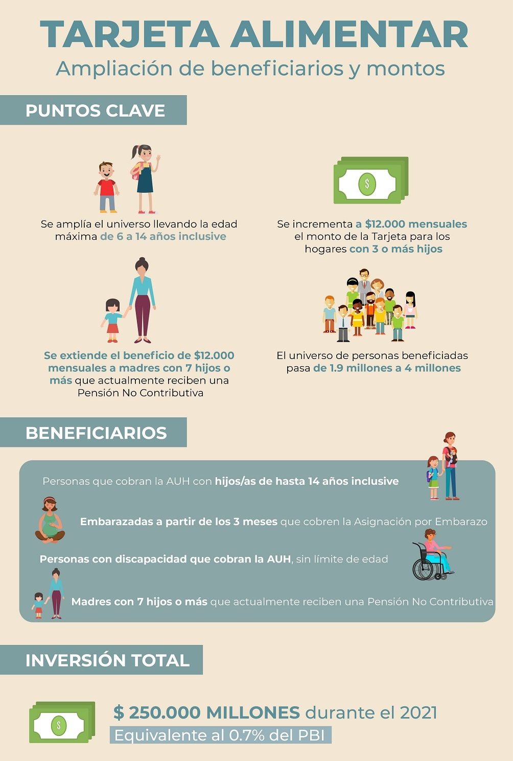 Representa una inversión mensual de 30 mil millones de pesos (hasta ahora eran 10 mil millones). El monto de la tarjeta será de 6.000 pesos para madres con un hijo; 9.000 pesos para dos hijos; y 12.000 para tres o más hijos.