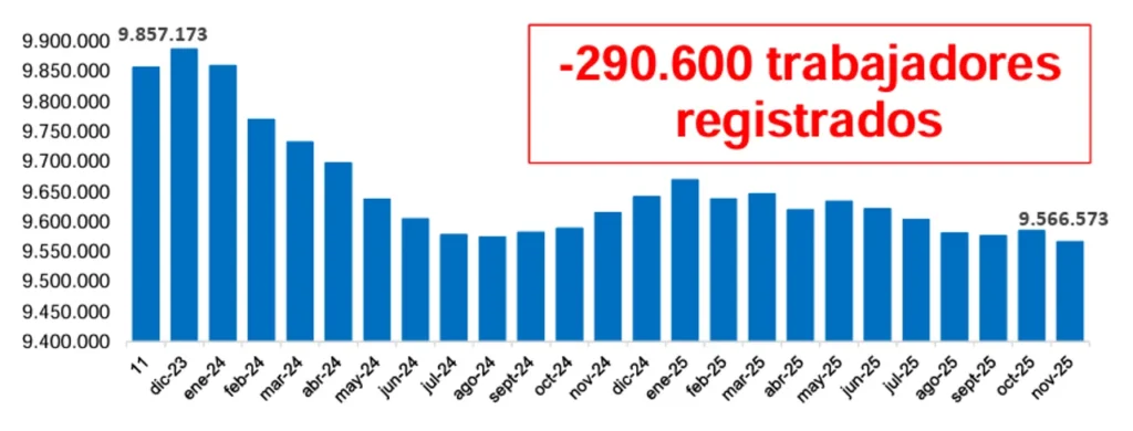 Tomando el mismo período, el número de trabajadores que se perdieron escala hasta los 290.600, lo que implicó una reducción del 2,77%: pasó de 9.857.173 en noviembre de 2023 a 9.566.573 en noviembre de 2025.
