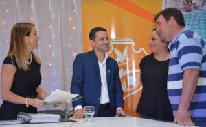El intendente Diego Blengino junto a la Escribana María Victoria Balbo, encabezaron el acto de la firma de 70 escrituras de las propiedades y terrenos del nuevo loteo municipal. La inversión superó los 50 millones de pesos.